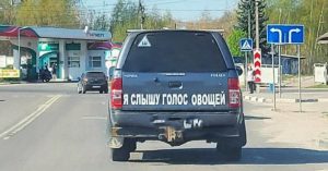 Телеграм-канал «Новости Москвы» опубликовал фотографию машины, на бампере которой можно прочитать надпись «Я слышу голос овощей» с комментарием «Дача зовет».