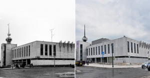 Южный речной вокзал после реставрации застрял между налипанием и обдиранием, между авангардом и евросараем, между ангаром и модной кофейней. Во время реконструкции он полностью лишился оригинальной облицовки, но фасад его пошел как бы пятнами: местами в него инкрустирована едва ли не бруталистская голая бетонная фактура, а местами он напоминает самую настоящую консервную банку — мутно поблескивающие вентфасады облепили его с разных сторон, тоже пытаясь выдать себя за бетон. Еще сильнее снижает впечатление от фасада прямоугольная сетка членений, распиливающая здание со всех сторон: она дробит массивность композиции и заставляет с содроганием вспомнить таких образцовых кадавров транспортного характера, как метро «Ховрино» или зал ожидания нового Щелковского автовокзала.