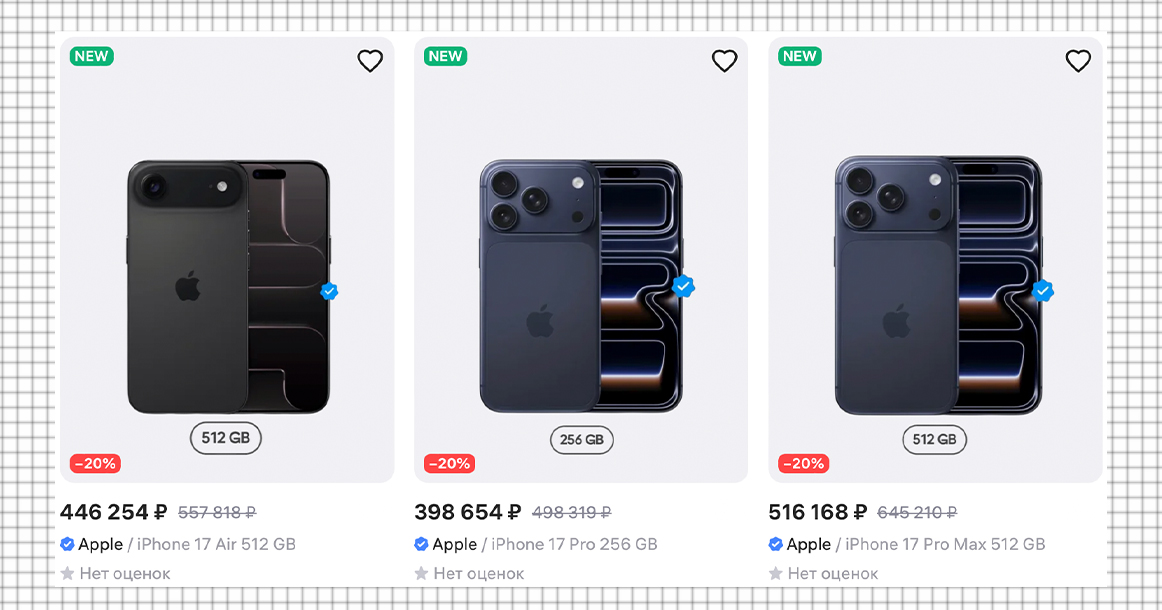 На маркетплейсах цены на iPhone 17 Pro и 17 Pro Max достигают 400–500 тыс. рублей. При этом речь идет не о покупке «из рук в руки», а лишь о предзаказе с ожиданием доставки.