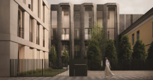 Второй корпус разместят во дворе — по рендерам это темный, почти черный объем с более плотной пластикой. В его архитектуре легко читаются интонации советского модернизма: тяжелые формы, строгий ритм, минимум декоративности.