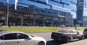 Сегодня целый день в соцсетях и телеграм-каналах постят видео с гигантской очередью. На них видно, что люди стоят цепочкой вдоль бизнес-центра «Президент Плаза» у метро «Кутузовская» — это, как мы знаем, часть «Сбербанк-Сити», штаб-квартиры «Сбера».