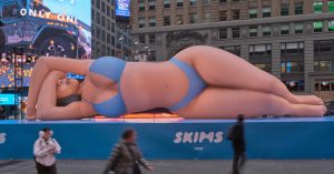 У Кардашьян есть собственный бренд нижнего белья Skims, и такой перформанс с 20-метровой надувной куклой в Нью-Йорке — часть рекламной кампании ее новой линейки купальников Skims Swim.