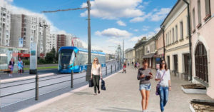Там же примерно посередине расположится и остановка новой-старой трамвайной линии. Она пойдет вдоль нечетной стороны улицы, на которой сохранилась историческая застройка — среда станет доступнее, будет приятнее ходить пешком. От дороги пешеходы на нечетной стороне будут фактически отделены трамвайными путями.