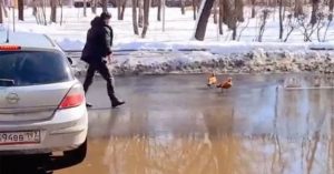 Женщина перекрыла Звездный бульвар, чтобы помочь уткам перейти дорогу