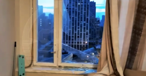 Жильцы дома напротив атакованной башни «Сити» показали выбитые стекла в их квартирах