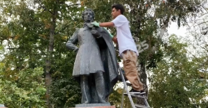 Житель Арбата каждый сезон сам отмывает памятник Пушкину на Спасопесковской площади