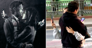 Шутку о том, что мобильник — продолжение нашей руки, художник Бэнкси «окартинил» еще в 2014 году, когда написал свою работу «Мобильные любовники» на двери клуба в Бристоле, ее позже продали за 670 тыс. долларов (вместе с дверью).
