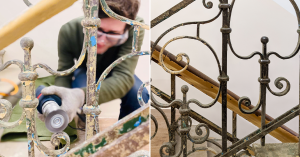 Когда с перил в нескольких местах сняли краску, выяснилось, что поручни сделаны из дуба с красивой текстурой. Изначально оригинальные перила, скорее всего, покрывали тонированным лаком. Сняв с металлической ограды слои краски, волонтеры обнаружили самый первый слой — черно-серого цвета. Жители после рекомендаций волонтеров решили, что перила надо спасать: в рамках капремонта их планировали заменить, а ограду покрасить еще одним слоем краски.