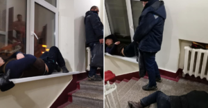 По ее словам, незваные гости разместились в подъезде между этажами и ведут себя довольно агрессивно. «Угрожают расправиться с жильцами подъезда, которые пытаются их выгнать со своих лестничных клеток», — рассказывает Островская. По фотографиям видно, что кто-то спит на подоконнике, а кто-то — прямо на лестнице.