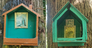 Птичья (или беличья) трапезные выкрашены в бирюзовый и бирюзово-коричневый цвета. Внутри все довольно аскетично — ничего, кроме икон. Одной из кормушек покровительствуют святыни Николая Чудотворца и Спасителя. Другой — образ святой княгини Анны Кашинской.