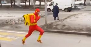Мужчина был одет соответствующе своей скорости — в красно-желтый костюм супергероя DC Флэша, самого быстрого в Лиге справедливости. Сперва доставщик бежал по бульвару вдоль линии монорельса, но потом понесся по левому ряду, обгоняя все соседние автомобили.