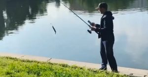 Парень с удочкой, поймавший среднего размера рыбу на Патриарших прудах, попал на видео. Его сняла местная недовольная жительница: «Вы сейчас чем занимаетесь, объясните, пожалуйста», — спрашивала она, в то время как рыбак пытался снять результат ловли на свой телефон.
