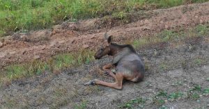 В телеграм-канале «Москва с огоньком» рассказали, что под подмосковным городом Пушкино, что в 17 км от МКАД, неизвестный водитель сбил лосиху, да так и оставил лежать на дороге. Местные, нашедшие животное, сообщают, что она не могла встать и погибла бы без помощи. На фото с места происшествия видно, что очень молодая лосиха (практически лосенок) находится в сознании, но лежит на боку прямо на проселочной дороге.