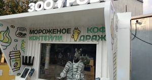 Робот делает мороженое, готовит напитки и раздает сладости, судя по надписям на кабине. Здесь же расположены экраны (видимо, с меню) и терминалы для оплаты банковской картой.