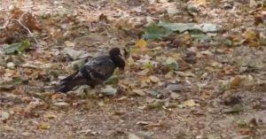 Странная мутация нисколько не мешает голубю заниматься своими голубиными делами — курлыкая ходить по земле и что-то клевать.