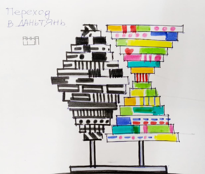 «Переход в Даньтянь» — интерактивная работа, сделанная из картонных труб, которые крутятся по своей оси. В основе работы — идея цигун о точке Даньтянь. Точка Даньтянь — центр тела, куда приходит и накапливается вся энергия, закручивается по спирали и гармонично распределяется по всему телу. Объекты метафорически отражают разные состояния человека. Черно-белый объект — это человек до занятий цигуном, а цветной — после многолетних практик.