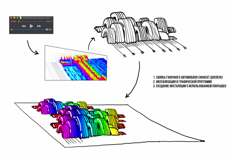 В основе работы — кристаллизация момента через цветовую и графическую визуализацию эффекта Доплера от звука проезжающей машины. Художники преобразовали звук в изображение и, получив трехмерную графическую модель звукозаписи, создали инсталляцию с использованием разноцветных покрышек. Идея Node Art — cделать материальным, увековечить мгновенное.