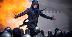 «Робин Гуд. Начало» (в кинотеатрах с 29 ноября) стартует с оформленного в виде комикса пролога, в котором закадровый голос, во-первых, призывает забыть все, что зритель когда-нибудь знал о Робине Гуде, а во-вторых, сообщает, что категорически не помнит, когда именно имели место дальнейшие события. Быстро выясняется, что эти слова значат гораздо больше, чем простое кокетство. Уже сцены боев в утопающей в пыльных бурях Аравии с участием арабских стрелометчиков напоминают скорее «Падение Черного ястреба», чем даже в меру ревизионистского «Робина Гуда» за авторством Ридли Скотта. Причем здесь нет никакого Ричарда Львиное Сердце (видимо, чтобы избежать привязки ко времени), а солдаты короля щеголяют в доспехах, максимально похожих на вполне современные бронежилеты. Жители Ноттингема не отстают и одеваются в разноцветные свитера и куртки из состаренной кожи, дизайну которых позавидовали бы кутюрье уровня Джона Варватоса (впрочем, не удивимся, если к его услугам производители фильма при подготовке костюмов и обращались). Апофеозом же служит главный модник — великолепный Бен Мендельсон в роли шерифа Ноттингемского, облаченный в какую-то совсем уж анахроническую кожаную шинель, отсылающую то ли к нацистам, а то ли и вовсе к русским революционерам начала прошлого века.