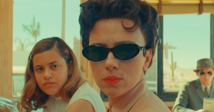 — в Город астероидов, где регулярно проводятся ядерные испытания, ежегодно съезжаются гении-вундеркинды со своими родителями. Только что овдовевший военный фотограф Оги Стинбек (Джейсон Шварцман играет не только его, но и актера, играющего Оги в пьесе внутри фильма) приезжает с сыном Вудроу (Джейк Райан) и тремя дочерьми и селится по соседству с актрисой Мидж Кэмпбелл (Скарлетт Йоханссон стилизована как Ким Новак в «Головокружении» Хичкока). Дочери закапывают прах матери чуть ли не на заднем дворе — к неудовольствию дедушки Стенли (сам Том Хэнкс), которому зять никогда не нравился. В кадре появляются и другие эксцентричные герои, как местные жители (Руперт Френд смешно играет ковбоя по имени Монтана), так и визитеры, так что пора перейти к следующему пункту;