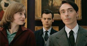 Действие «Моего полицейского» (в британском прокате с 4 ноября, в России фильм можно посмотреть онлайн у пиратов) происходит в 1957-м. Молодой служитель закона Том Берджес (поп-звезда Гарри Стайлс) случайно знакомится на улице с сотрудником Брайтонского музея Патриком Хэйзелвудом (Дэвид Доусон), речь заходит об искусстве, и куратор приглашает нового знакомого зайти к нему на работу и даже предлагает устроить ему персональную экскурсию. Тем временем Том начинает ухаживать за учительницей Мэрион (Эмма Коррин), потом женится на ней, и вот уже троица проводит вместе вечера, ходит на концерты и обсуждает «Воскрешение Лазаря» Яна Ливенса. «Простоватый» Том тянется к искусству, Мэрион это поощряет и уважает в отличие от связи мужа с Патриком, в гомосексуальности которого она убедилась, случайно подсмотрев за супругом (Тома она гомосексуалистом не считает, видимо, слово «бисексуал» учительницам 1950-х узнать было негде, так что она начинает носиться с идеей «вылечить» мужа от «этого извращения» как от простуды).