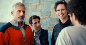 — «Зачем вообще работать? Создаешь крутой искусственный интеллект — и он делает все остальное», — говорит один из четырех героев «На вершине горы» Джефф (Рами Юссеф), состояние которого оценивается в 59 млрд долларов. Джефф приезжает в дорогущий и высокотехнологичный, но крайне неуютный и мрачный дом Хьюго Ван Ялка (Джейсон Шварцман), которого друзья называют «Супс» (от «Бесплатного супа» — Хьюго самый «бедный» в компании, обладатель «всего» 521 млн, отчего испытывает комплекс неполноценности). Остальные гости — давний конкурент Джеффа, самый богатый (220 млрд) из четверки, основатель соцсети Traam (4 млрд пользователей) Венис Пэриш (Кори Майкл Смит), который уверен, что его новая придумка — приложение для дипфейков — помирит израильтян с палестинцами, и инвестор Рэндалл (Стив Карелл), идеолог новых технологий и первопроходец (состояние — 63 млрд). Оттого, что действие ограничено пространством дома, а героев всего четверо, «На вершине горы» похож на концептуальный телеспектакль о жизни богов на Олимпе, и эти же правила игры делают фильм клаустрофобным, а его персонажей — оторванными от реальной жизни нелепыми фигурами, живущими в выдуманном мире;