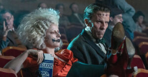 — Джесси Бакли, которая буквально на днях, 15 марта, должна получить «Оскар» как лучшая актриса года за роль в другом фильме — «Гамнет», играет сразу двух героинь — саму Мэри Шелли, давшую жизнь, если так можно сказать, ожившему трупу, который развлекает нас вот уже два века, и проститутку Иду. Как-то выпив в баре и осмелев, Ида начала выводить на чистую воду главаря чикагской мафии мистера Лупино (хорват Златко Бурич, давно привыкший к своему голливудскому амплуа олигархов и бандитов) и в итоге полетела вниз по лестнице навстречу своей смерти. В это же время (а дело происходит в 1936-м, через год после выхода в прокат «Невесты Франкенштейна», но авторы «Невесты!» делают вид, что ее не смотрели) монстр Франкенштейна, который откликается на укороченное Фрэнк (Кристиан Бэйл), стучится в институт к доктору Корнелии Эфрониус (Аннетт Бенинг) — именно она, уверено страдающее чудовище, может создать ему подругу и избавить от одиночества, на что ученая резонно ему отвечает, что «в наше время» решить проблему секса можно куда проще. Недолго посопротивлявшись, Корнелия находит труп Иды и оживляет его, а дальше как будто начинается «Бонни и Клайд» с элементами «Джокера 2»;