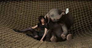Конечно, Тим Бертон снял фильм не про слоненка. Он снял фильм про хозяина цирка (то есть чуть про себя самого) Максимилиана Медичи (Дэнни Де Вито), чьи лучшие годы позади, и он потихоньку распродает инвентарь, чтобы как-то протянуть до следующего выступления. В труппу с Первой мировой возвращается потерявший руку наездник Холт Фаррьер (Колин Фаррелл), готовый работать кем угодно. Как раз у недавно купленной слонихи Миссис Джамбо рождается уродливый слоненок, которого сама публика тут же называет Дамбо, а дети Холта, случайно увидев, что мимимишное существо взлетает при виде любого перышка, начинают его тренировать подольше задерживаться в воздухе. Наконец Дамбо начинает летать под куполом к восторгу публики, и к Медичи приезжает успешный импресарио и главный злодей фильма по фамилии Вандевер (Майкл Китон) с французской трофейной девицей-акробаткой Колетт (Ева Грин).