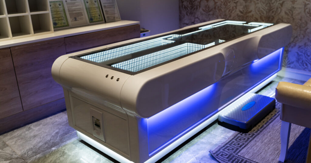 И вот Мякинино, медицинский кабинет в Box City на задворках «Крокус Экспо». Дают изучить противопоказания — их много, мне — можно. Раздеваться не надо, только снять с себя все украшения, достать из карманов металлические предметы и банковские карты. Заводят агрегат — он шумит и красиво светится. Сквозь стекло виден похожий на конфорку круг — во время сеанса именно он движется внутри аппарата, излучая целительные волны.