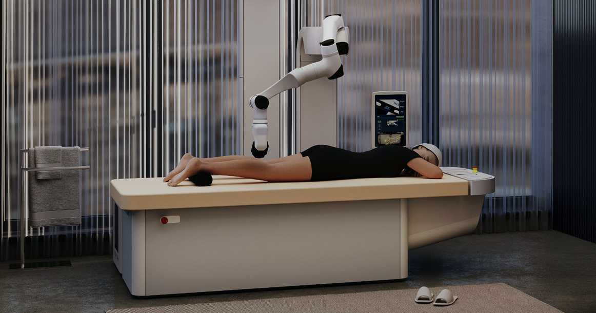 В отгороженном от офиса пространстве стоит массажный стол, сверху панель с камерами-«глазами», главное действующее лицо — роботизированная «рука» с массажной манипулой. Перед началом сеанса вводят данные клиента (рост, вес), дальше встроенные 3D-камеры сканируют тело и создают его трехмерную карту. Система на базе ИИ анализирует данные, рассчитывает оптимальные траектории массажа и направляет «руку» с манипулой.