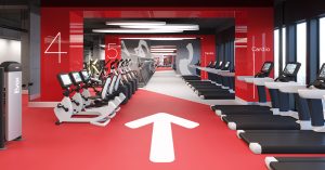 Фитнес-пространство площадью 2700 кв. м занимает четвертый этаж комплекса. Интерьер клуба создавали по авторскому проекту. Однако в нем явно видна общая дизайнерская линия, в которой исполнены все новые клубы сети последних лет. Яркое оформление в фирменных цветах World Class — белом и красном. Они отлично дополняют минималистичный футуризм динамикой и пульсирующей энергией.