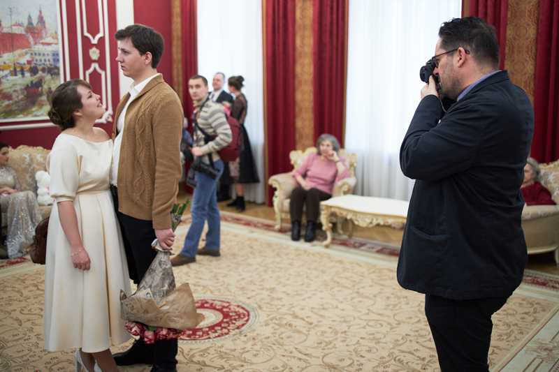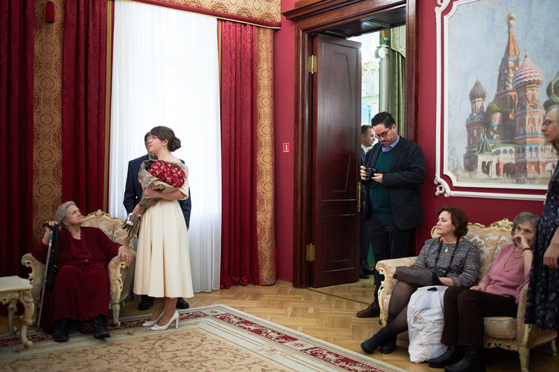 Суббота — день свадеб. Мы с Томасом встречаемся у Грибоедовского дворца бракосочетания. Цель дня — найти сцену, похожую на кадр из фильма «Я шагаю по Москве». Сначала мы наблюдаем за общей атмосферой, а потом одна из пар соглашается пустить нас на церемонию, и вот кадр снят.