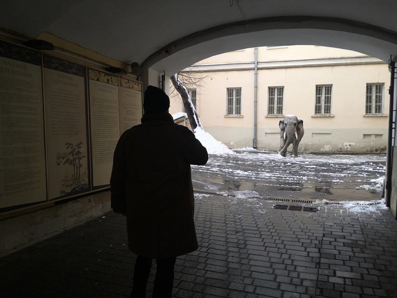 На пути к памятнику нас ждет сюрприз: из двора музея Востока выглядывает…  слон.