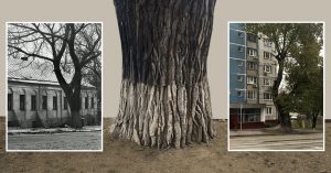 «На архивных фотографиях 1930-х годов нашей речки Золотой Рожок эти оба тополя уже есть. Сколько себя помню, всегда стояли!» — с Анной, вышедшей на прогулку с собакой, мы говорим под самым деревом. Несмотря на позднюю осень, крона в листьях. Я разглядываю причудливые глубокие извивы коры.