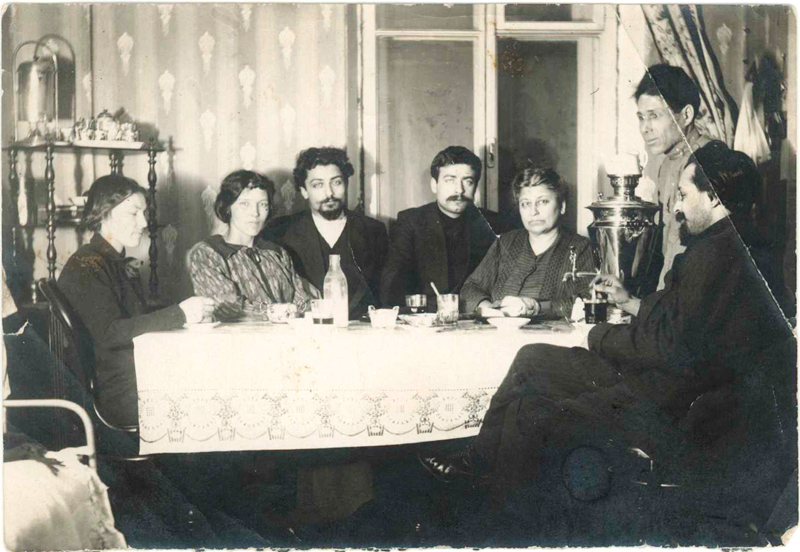 За столом слева направо: неустановленное лицо, Клавдия Манаева, Иосиф Карахан, неустановленное лицо, Вера Татуловна Карахан, неустановленное лицо, Лев Карахан. 1910-е