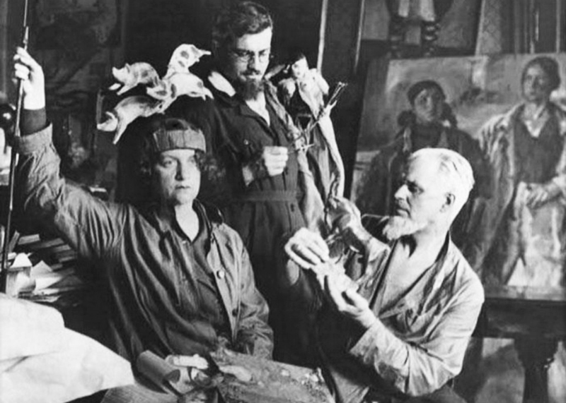 Нина Симонович-Ефимова, сын Адриан и Иван Ефимов в мастерской, 1932
