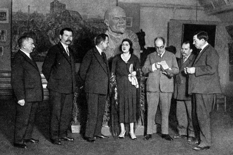 Сабуров, зам. Председателя Правления Всекохудожника B. Ф. Сахаров, Председатель ЦК профсоюза работников искусств Ю. М. Славянский, Н. А. Розенель-Луначарская, А. В. Луначарский, художники П. А. Радимов и И. И. Машков. Конец 1920-х гг.