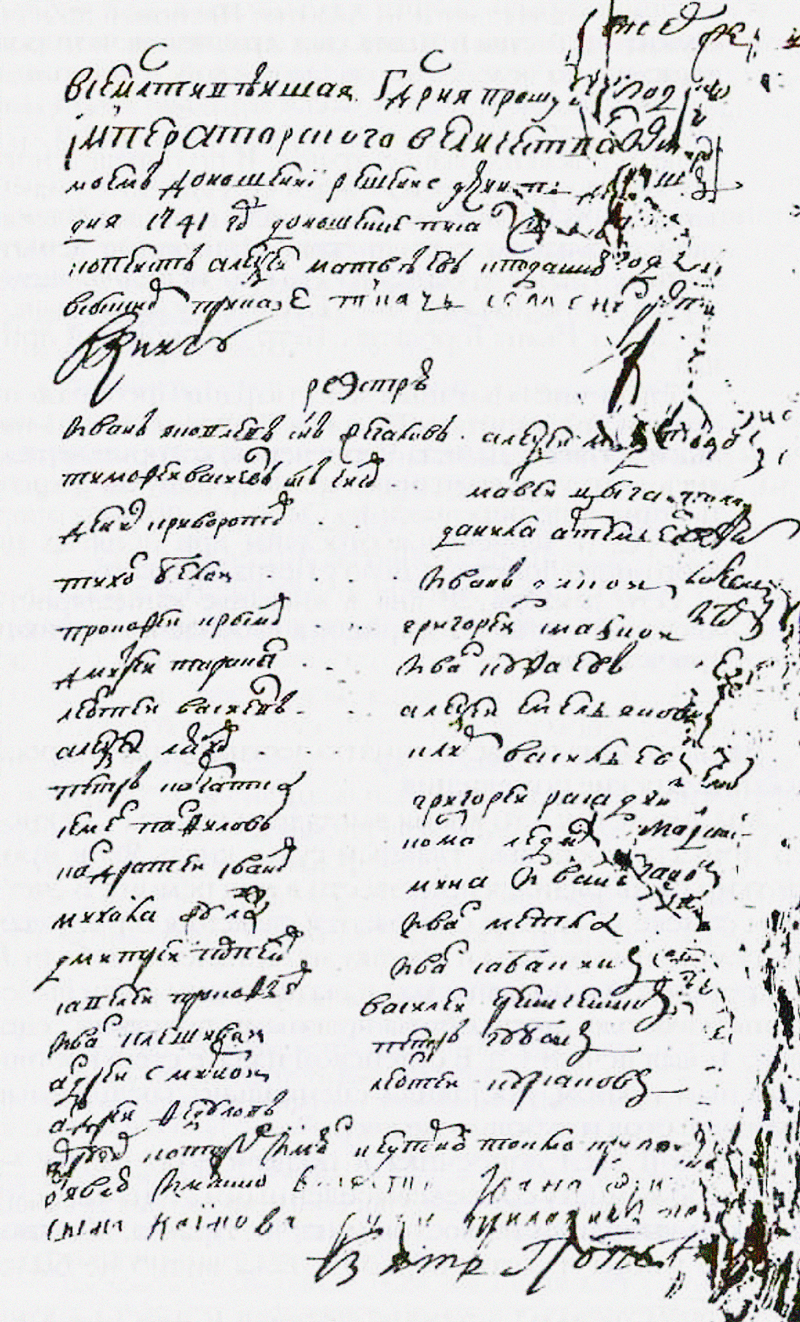 Фрагмент доношения Ивана Каина в Сыскной приказ с реестром его товарищей -«мошенников», 27 декабря 1741 г.