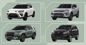 Следующий в иерархии — кроссовер Korando длиной 4,45 метра и стоимостью 4,04–5 млн (опять же есть и передний, и полный привод). Модель явно не новая, что заметно по интерьеру, но это скорее в плюс, поскольку гораздо проще регулировать климат. Кстати, шасси Korando неплохое — без проблем валит по сельской местности по любому покрытию. Энергоемкость отличная. У нас это любят.