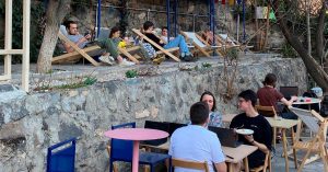 Чтобы подъехать к «Посольству» со стороны Каскада, придется взобраться на небольшую горку, поэтому водитель с видимым удовольствием высаживает меня где-то на середине улицы. Но впереди уже видна увитая плющом ограда, на которой из-под зарослей партизански выглядывают буквы ПЭУ. Внутри за голубой дверью — камерный уют типичного армянского дворика, столики, расставленные прямо в саду, и радужный флаг со словом pace, что может означать как «мир» на итальянском, так и «шаг» по-английски. Изнутри дворик и стены особняка выкрашены в нежно-розовый цвет. Говорят, что здесь раньше находилась то ли резиденция посла Марокко, то ли офис какой-то IT-компании.