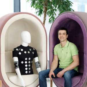 Отдельная сложность — интегрировать эти элементы, которые мы назвали дотами, в одежду. Одежда должна быть обтягивающей, плотно прилегать к телу, чтобы доты его касались. Мы долго советовались с технологами, которые занимаются спортивными изделиями, и они подсказали, что самый простой путь — это присоединять доты термотрансферными пленками, то есть пленками, которые приклеиваются к одежде под воздействием температуры через пресс. Эта технология часто используется для нанесения принтов на одежду.