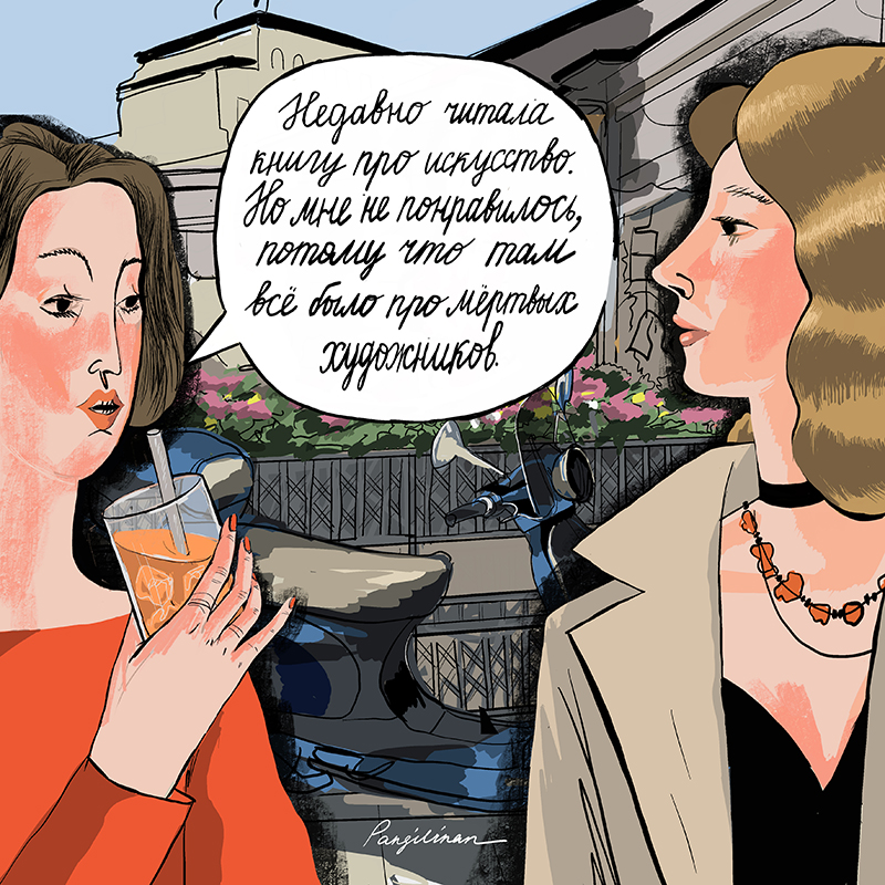 — Я недавно видела женщину на улице, у нее на майке написано «I hate everyone». И она при этом улыбается, счастливая такая, знаешь, стоит.