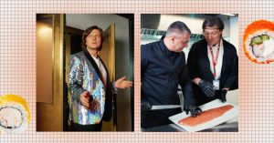 «А теперь пошлепайте лосось», — дружелюбно советует музыкант одному из поваров на кухне, разделывающему рыбу для придирчивых клиентов.