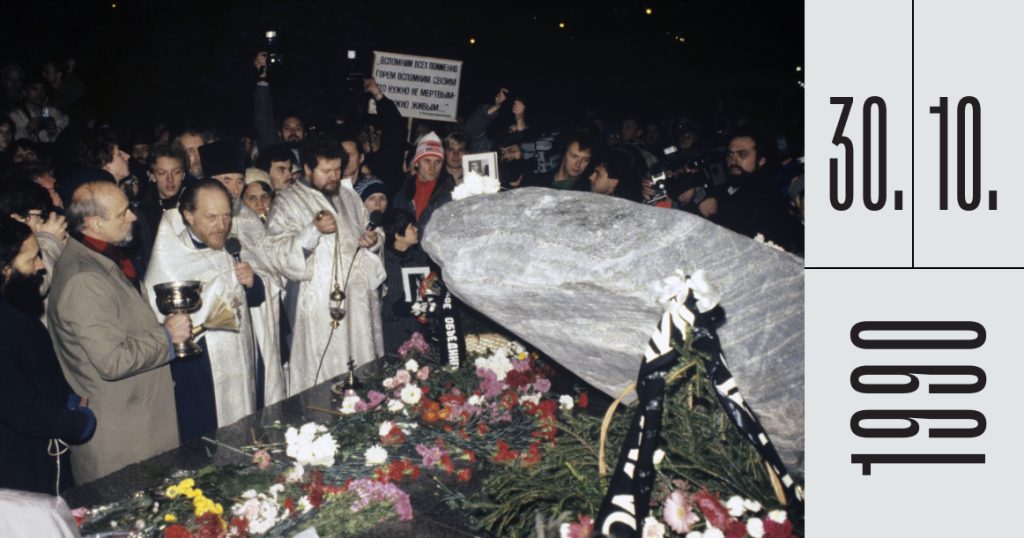 Мемориал памяти жертв репрессий открылся в День политзаключенного 30 октября 1990 года в сквере возле Политехнического музея. Накануне состоялся яростный спор о тексте, который следовало выбить на граните. Строки Ахматовой и Евтушенко отвергли как слишком невнятные. Долго спорили о прилагательном к слову «режим». «Советский» и «коммунистический» отвергли и сошлись на «тоталитарном». Теперь надпись гласит: «Этот камень с территории Соловецкого лагеря особого назначения доставлен обществом “Мемориал” и установлен в память о миллионах жертв тоталитарного режима. 30 октября 1990 года в День политзаключенного в СССР».