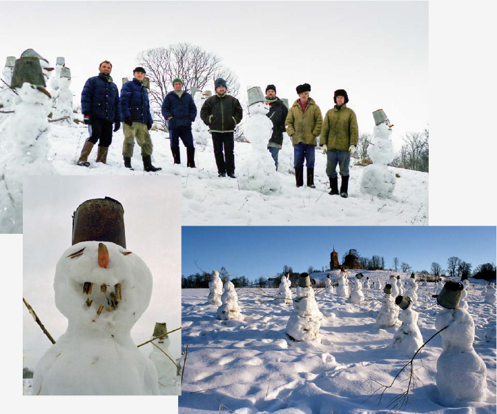 Но где делать? В Москве снег грязный. Конечно, подумал я, нужно сделать в деревне. Там ко мне привыкли, мужики бы помогли. Мы приехали туда втроем — я, Батынков и Лобанов; по-моему, с нами еще был Григорий Ярошенко, фотограф. Слепили двух-трех снеговиков. Устали невероятно. Сфотографировались.