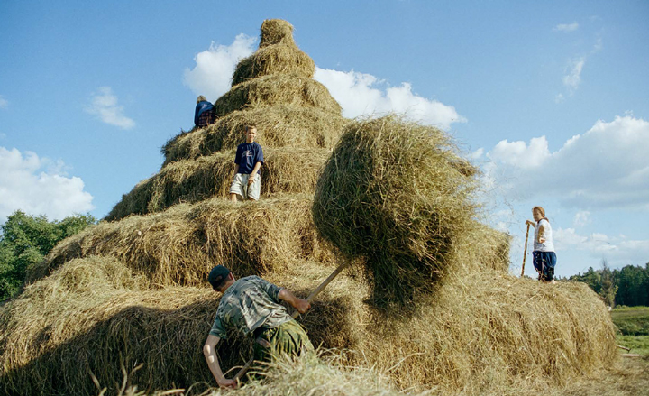 И мы с ними косили-косили, ворошили-ворошили, стоговали-стоговали. Но сена все не хватало и не хватало, хотя мы для экономии сена сделали такой чум — внутри часть полая. Я даже договорился с трактористом по кличке Доллар, который начал возить мне сено в рулонах: колхоз еще был, и он рулонил. В какой-то момент он просто на этой горе ковырнул трактор. Заработать ему не удалось, пришлось в колхоз что-то выплачивать, но он был героем. Я его отснял с молодыми девушками в обнимку: трактор лежит, колеса наверху, а он счастливый снимается.