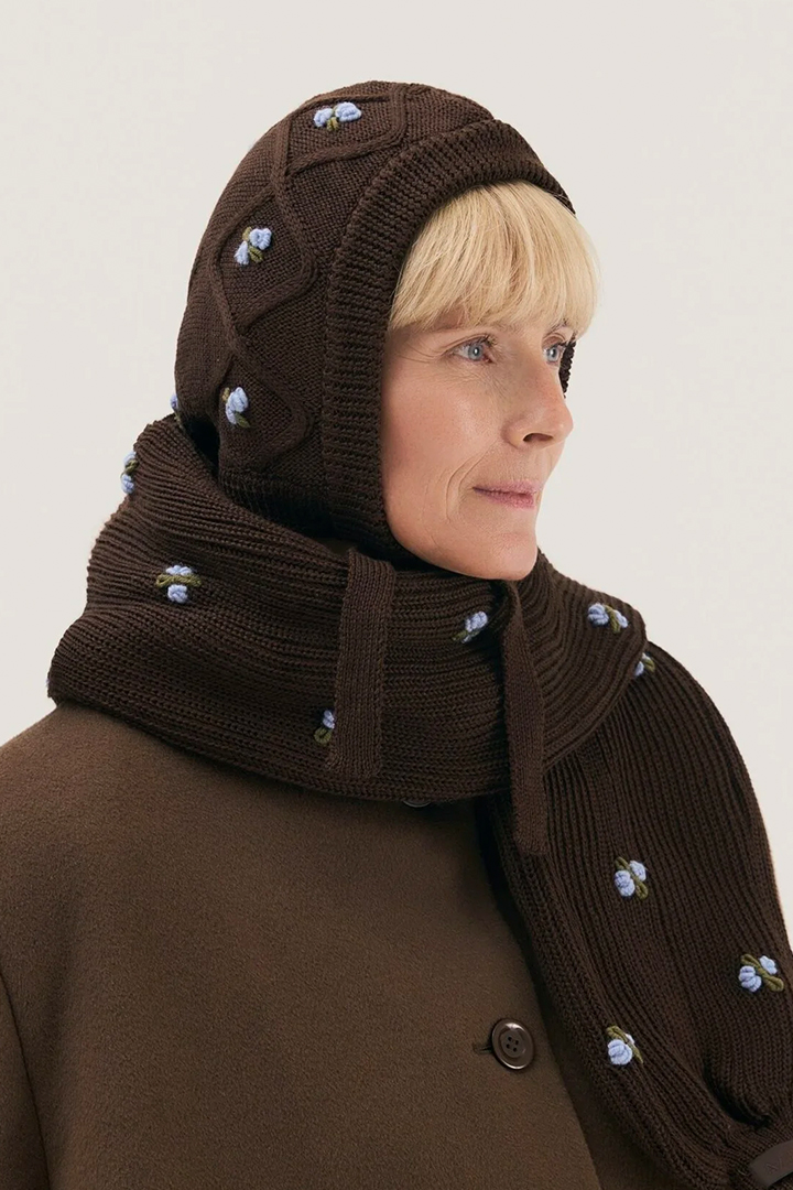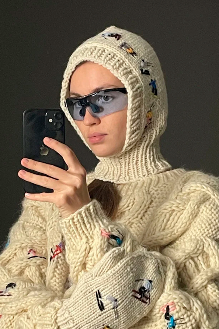 Чепчик не самый теплый вариант на зиму, зато самый яркий согласно нашим брендам — Svyazat, Mirstores и Tete bonnet уже не первый сезон украшают их вышивкой и пайетками. Капор в отличие от балаклавы не закрывает лицо, но при этом и не дает простыть шее. Балаклава же спасает, когда гулять с открытым лицом на улице уже холодно. В метро их, конечно, лучше снимать.