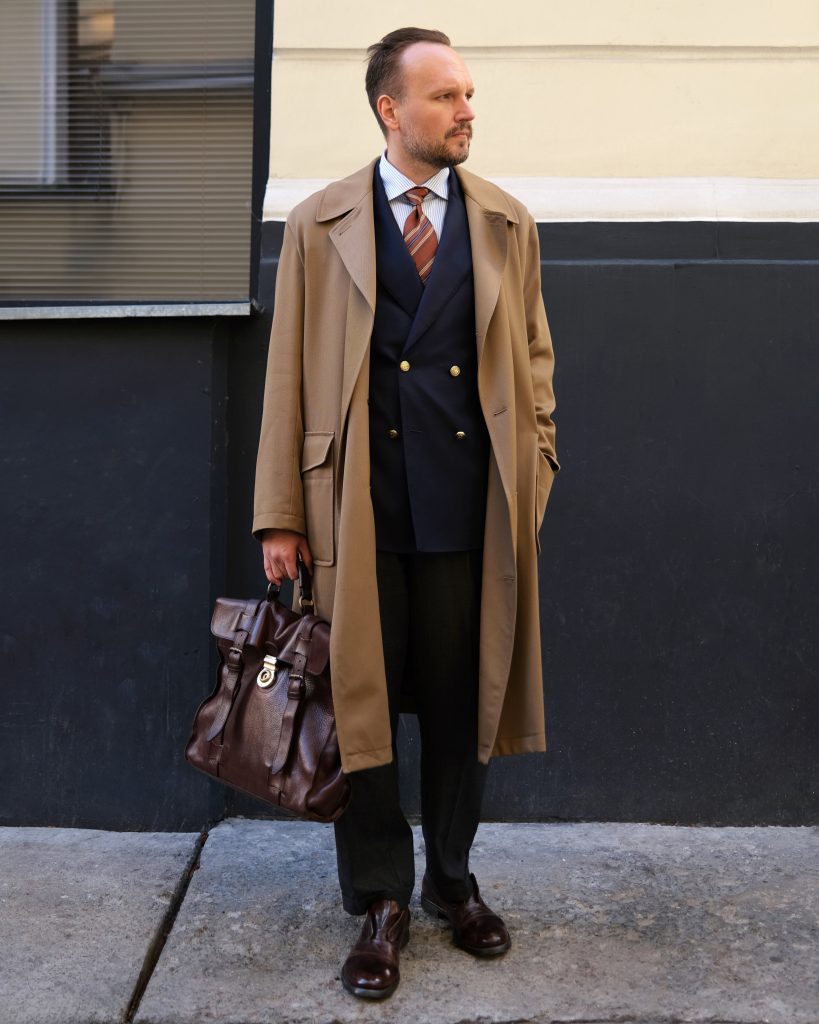 Тренч — Hugo Boss, брюки — Lime, блейзер сшит в ателье, дерби и портфель из мягкой кожи привезены из Италии.