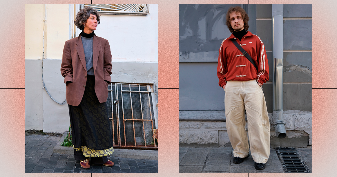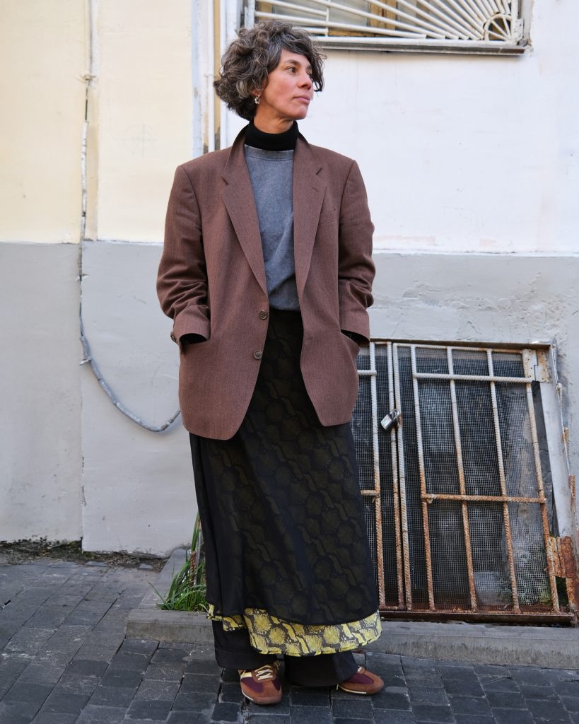 Пиджак — винтаж, юбка — Monkey (надета наизнанку), брюки — винтаж, футболка и свитер — массмаркет, кроссовки — Adidas.
