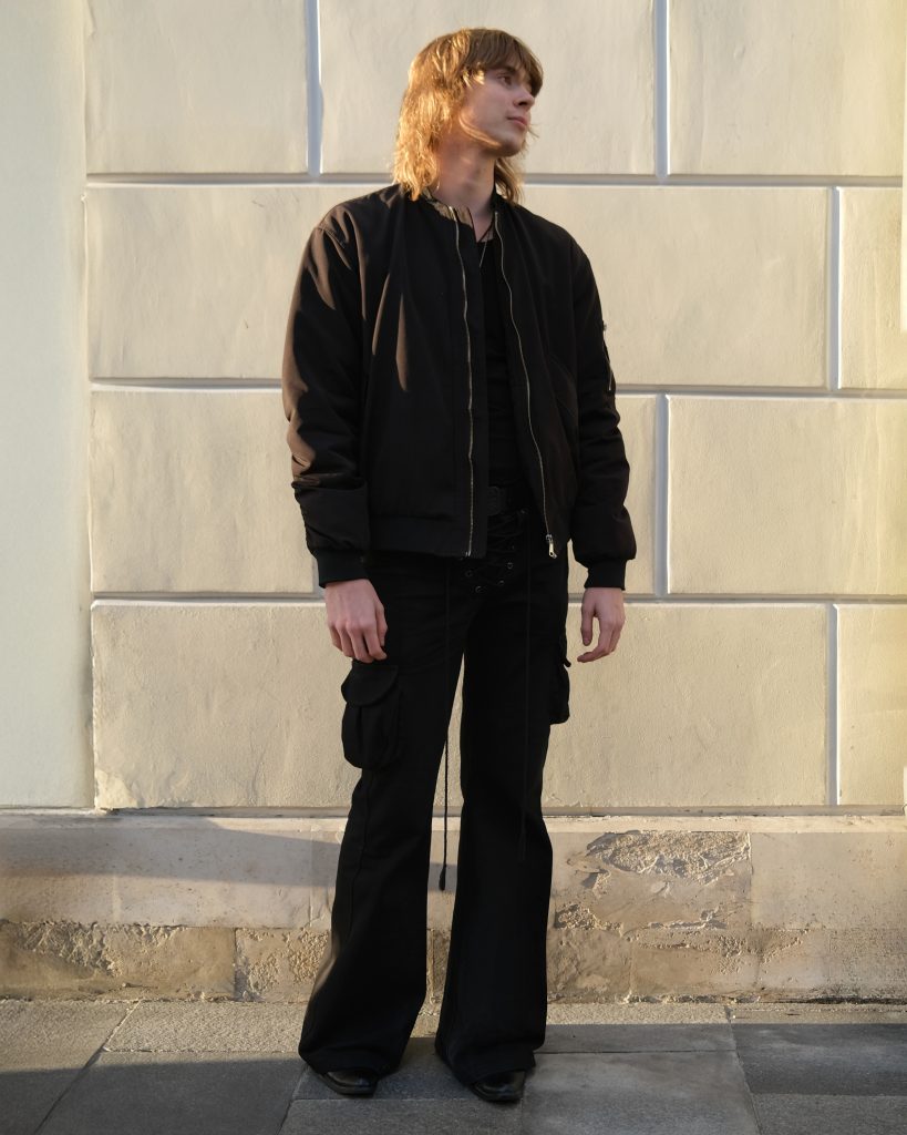Бомбер — массмаркет, брюки и футболка — российский бренд Seraphim, ремень — Wrangler, аксессуары — Christian Poell, казаки — винтаж.
