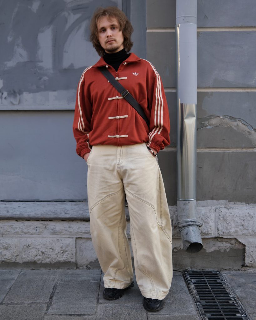 Куртка — Adidas из японской коллекции, штаны — массмаркет, ремень — Corona Extra.